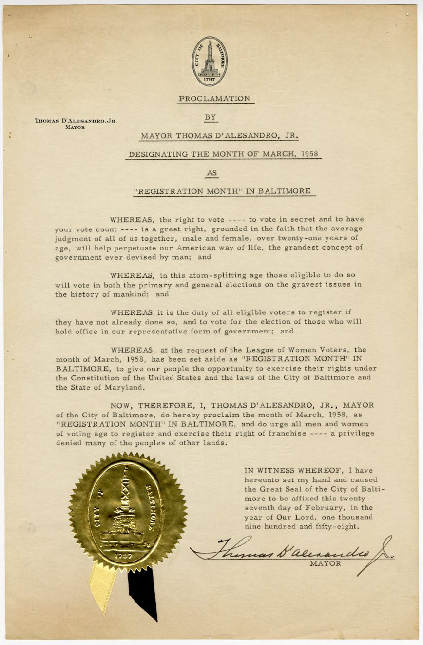 “Registration Month” Proclamation in Baltimore, March 1958. Source: League of Women Voters of Baltimore City Records, R0061-LWV, University of Baltimore Special Collections & Archives.