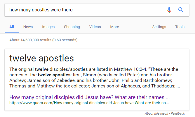 Here’s a question: how many apostles are there in the Christian tradition? Google tells you, via a panel, even pulling out the number, thereby making it look decidedly objective: there are twelve!