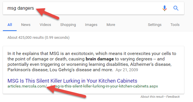 All this changes if you use the language of fringe groups that believe the medical community is suppressing a link between MSG and a variety of neurological disorders. Here’s what you get when you type in ‘msg dangers’: